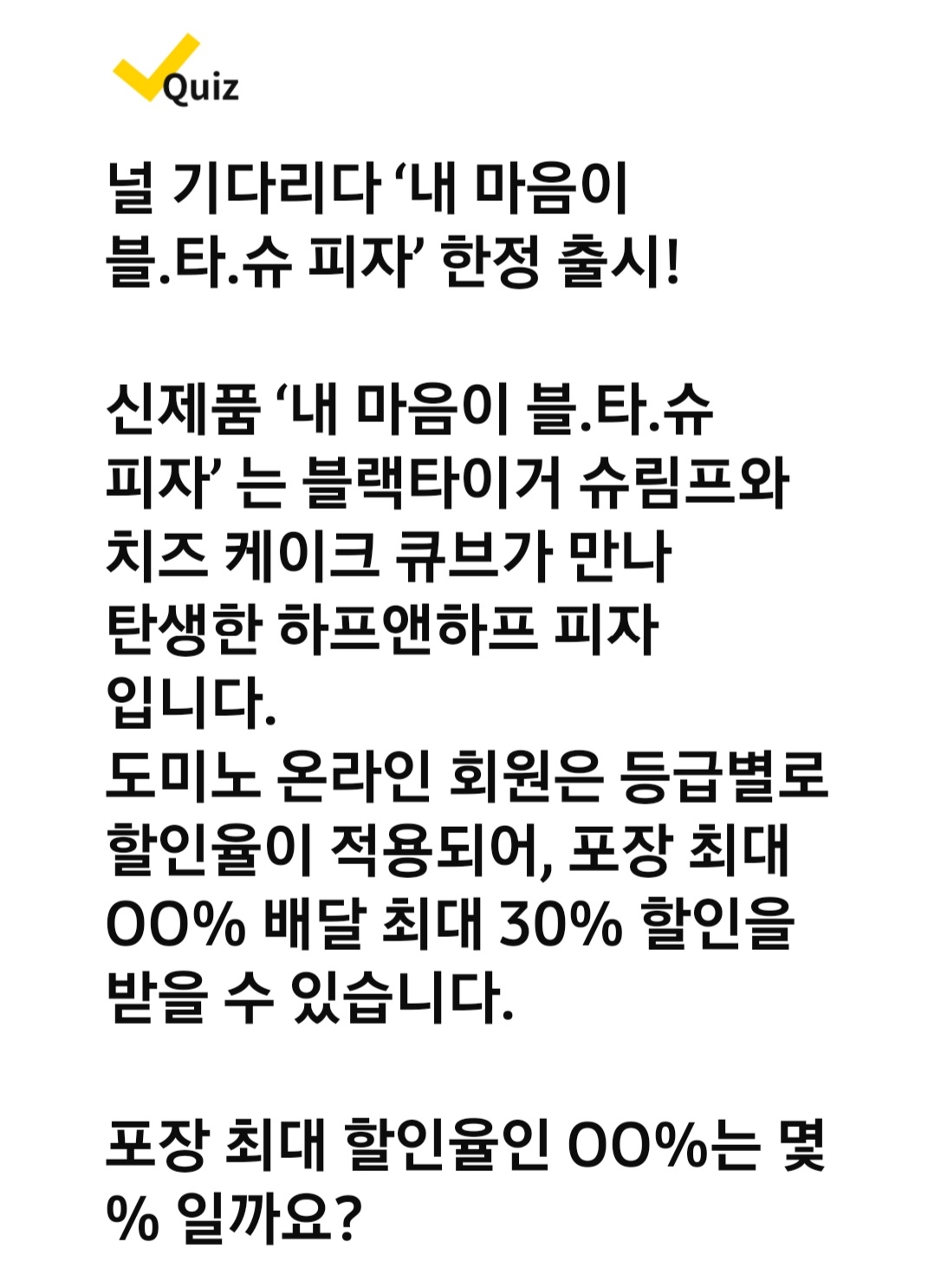 Q. 널 기다리다 '내 마음이 블.타.슈 피자' 한정 출시! 신제품 '내 마음이 블.타.슈 피자' 는 블랙타이거 슈림프와 치즈 케이크 큐브가 만나 탄생한 하프앤하프 피자입니다. 도미노 온라인 회원은 등급별로 할인율이 적용되어, 포장 최대 00% 배달 최대 30% 할인을 받을 수 있습니다. 포장 최대 할인율인 00%는 몇 % 일까요?
