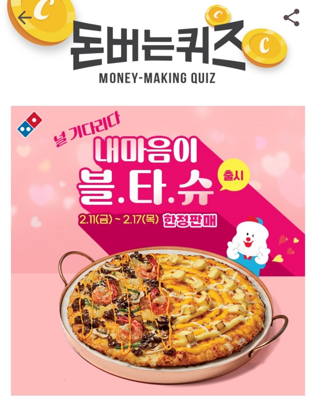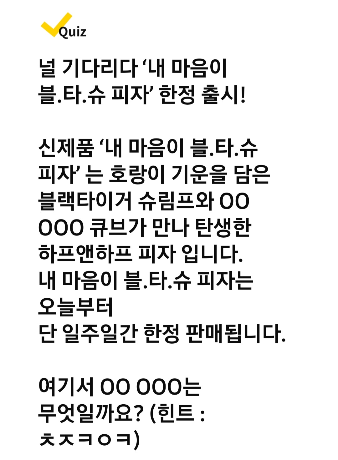 널 기다리다 '내 마음이 블.타.슈 피자' 한정 출시! 신제품 '내 마음이 블.타.슈 피자' 는 호랑이 기운을 담은 블랙타이거 슈림프와 00 000 큐브가 만나 탄생한 하프앤하프 피자 입니다. 내 마음이 블.타.슈 피자는 오늘부터 단 일주일간 한정 판매됩니다. 여기서 00 000는 무엇일까요? (힌트 : ㅊㅈㅋㅇㅋ)