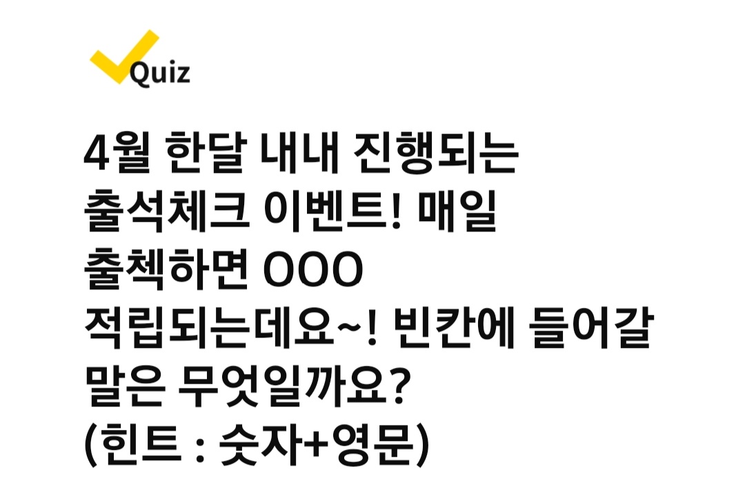 Q. 4월 한달 내내 진행되는 출석체크 이벤트! 매일 출첵하면 000 적립되는데요~! 빈칸에 들어갈 말은 무엇일까요? (힌트 : 숫자+영문)