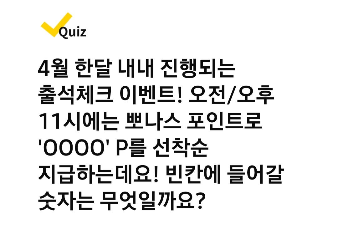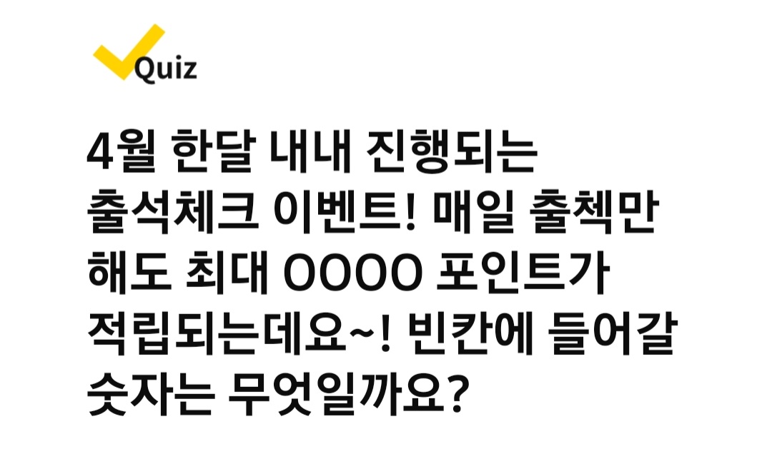 Q. 4월 한달 내내 진행되는 출석체크 이벤트! 매일 출첵만 해도 최대 0000 포인트가 적립되는데요~! 빈칸에 들어갈 숫자는 무엇일까요?
