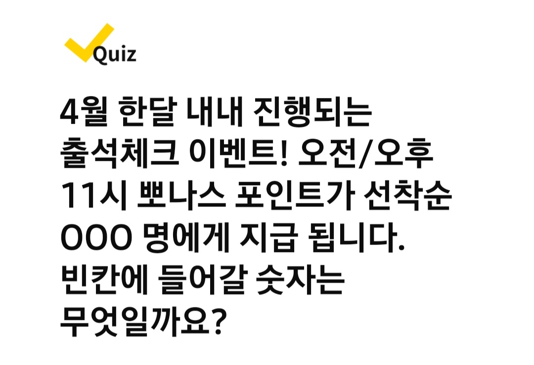 Q. 4월 한달 내내 진행되는 출석체크 이벤트! 오전/오후 11시 뽀나스 포인트가 선착순 000 명에게 지급 됩니다. 빈칸에 들어갈 숫자는 무엇일까요?