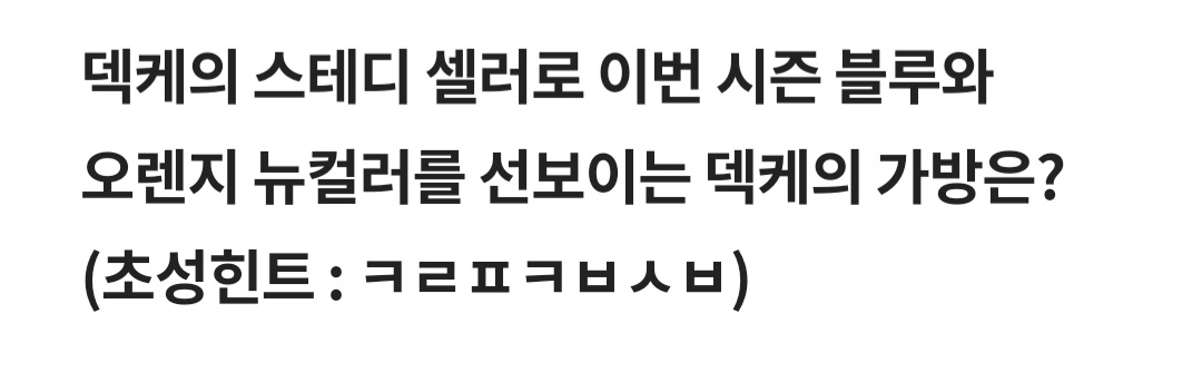 Q. 덱케의 스테디 셀러로 이번 시즌 블루와 오렌지 뉴컬러를 선보이는 덱케의 가방은? (초성힌트 : ㅋㄹㅍㅂㅅㅂ)