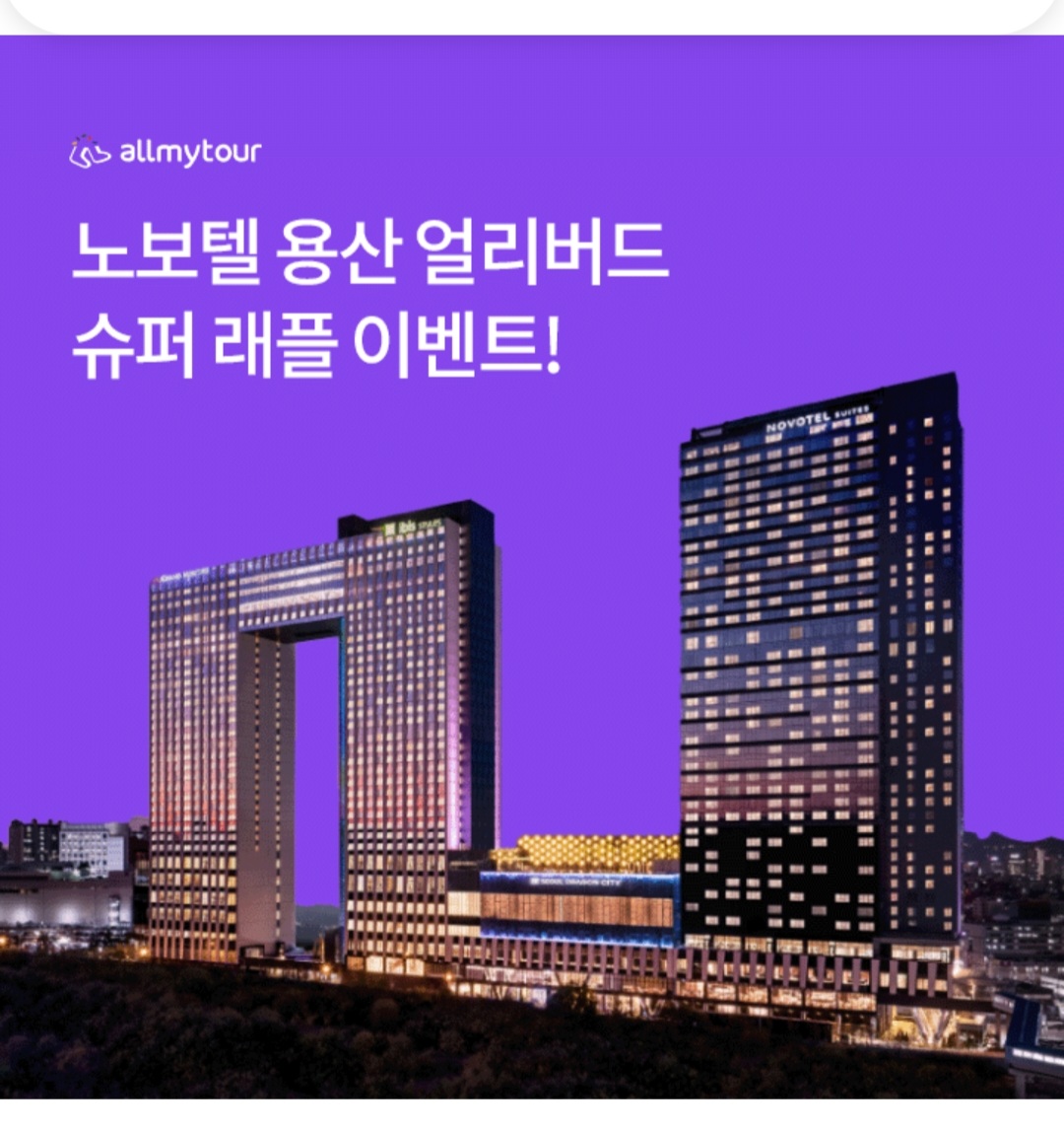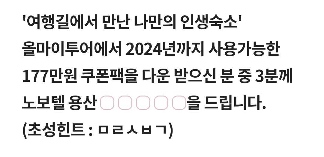 Q. '여행길에서 만난 나만의 인생숙소' 올마이투어에서 2024년까지 사용가능한 177만원 쿠폰팩을 다운 받으신 분 중 3분께 노보텔 용산○○○○○을 드립니다. (초성힌트 : ㅁㄹㅅㅂㄱ)