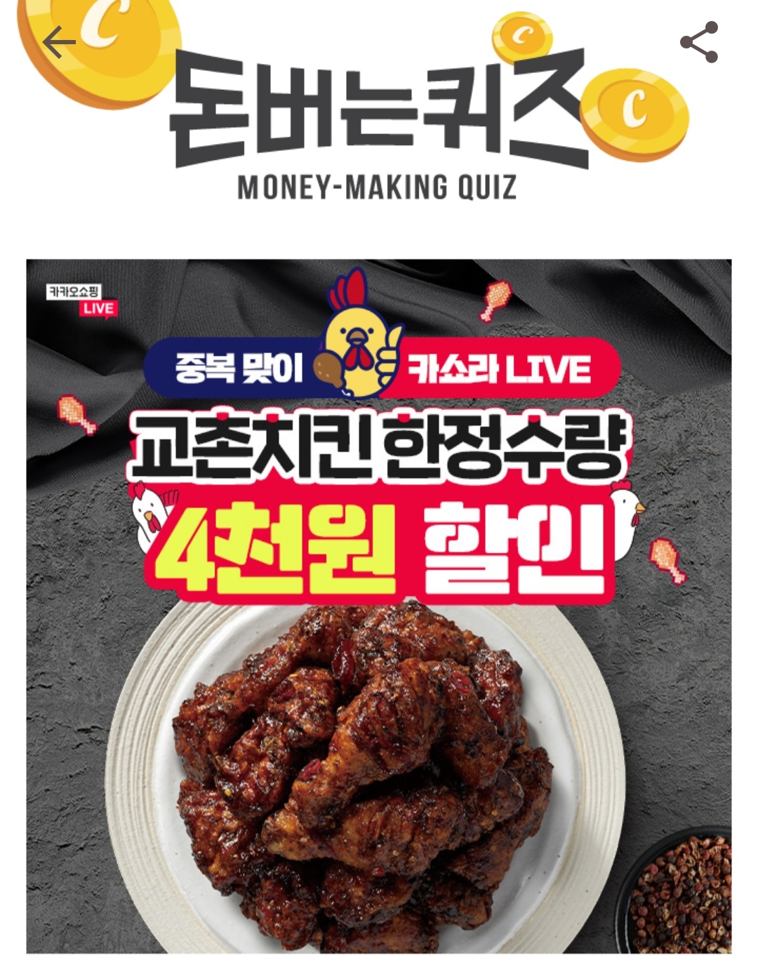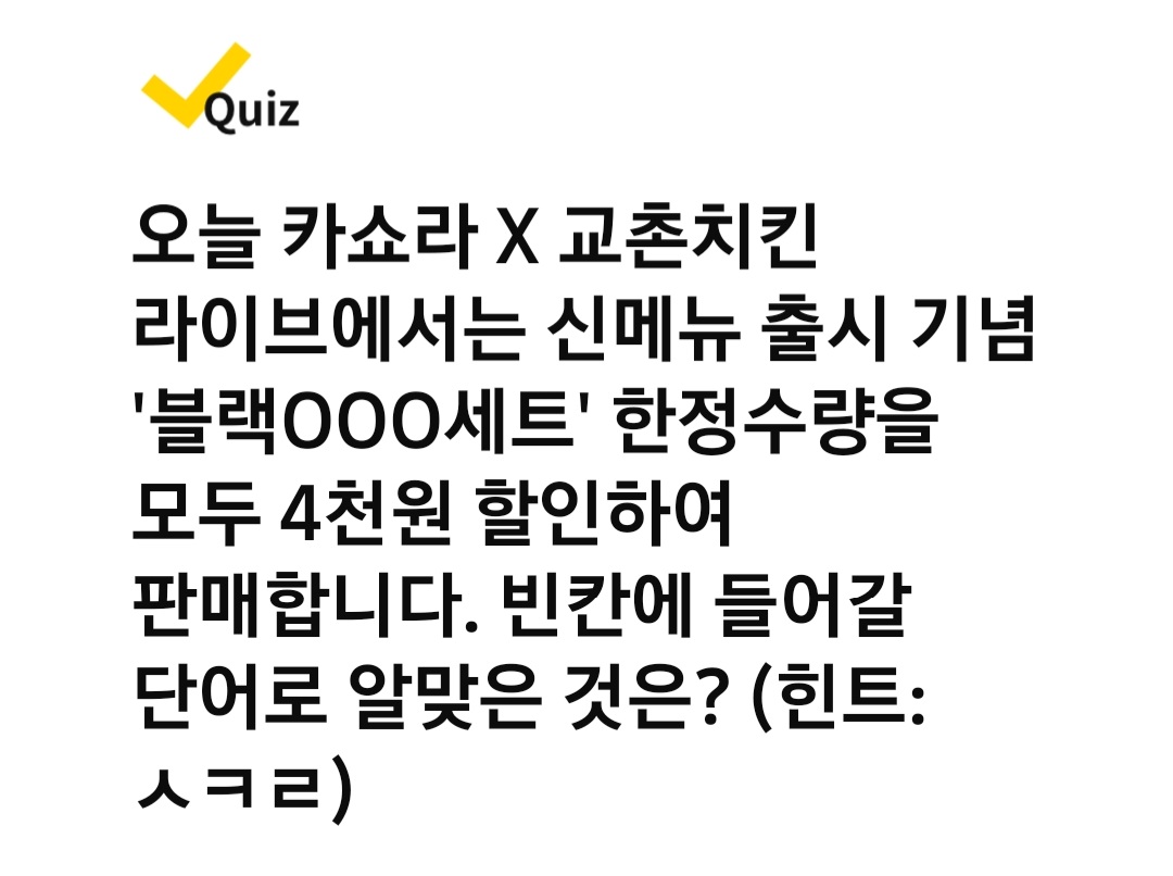 Q. 오늘 카쇼라 X 교촌치킨라이브에서는 신메뉴 출시 기념 '블랙OOO세트' 한정수량을 모두 4천원 할인하여 판매합니다. 빈칸에 들어갈 단어로 알맞은 것은? (힌트: ㅅㅋㄹ)