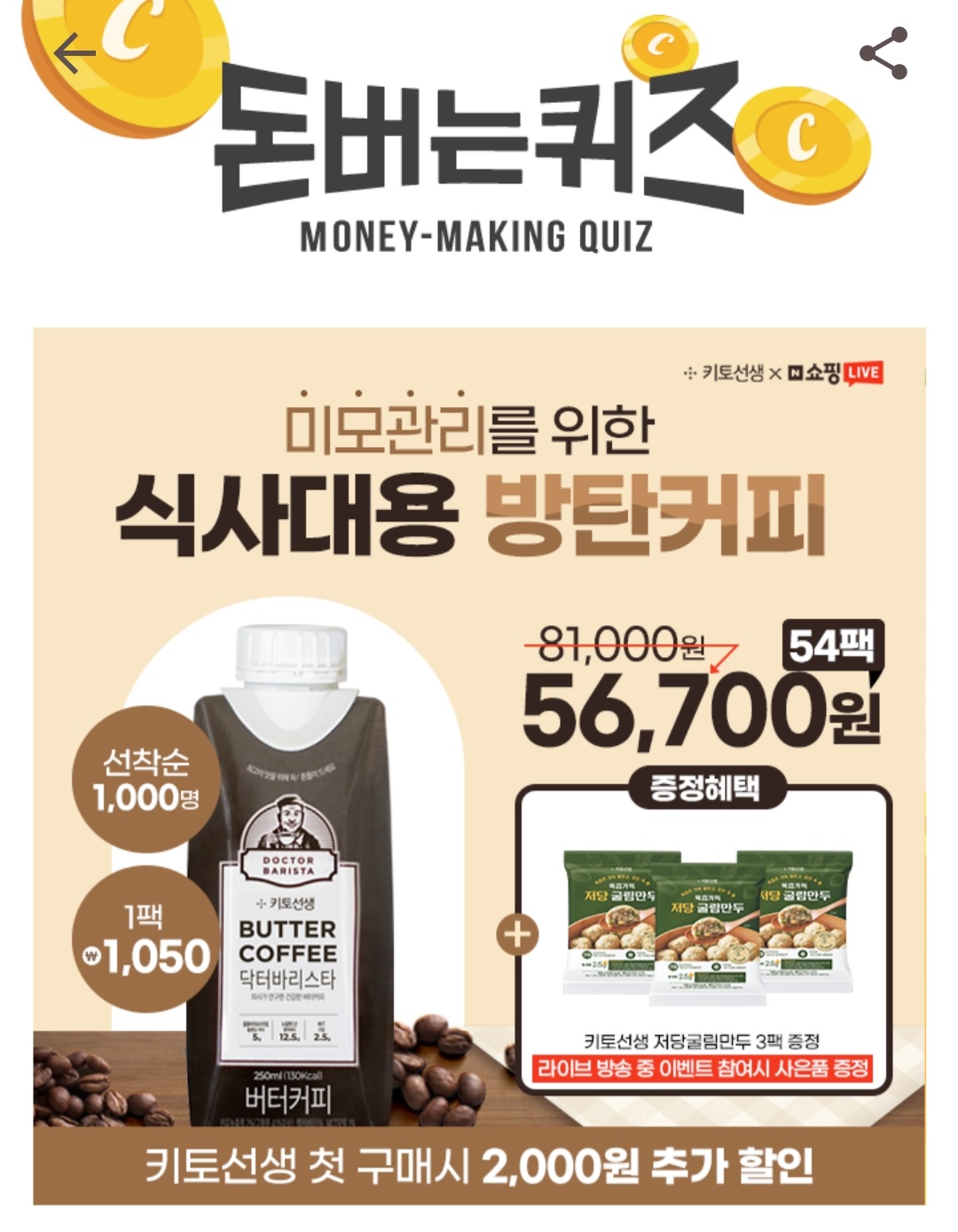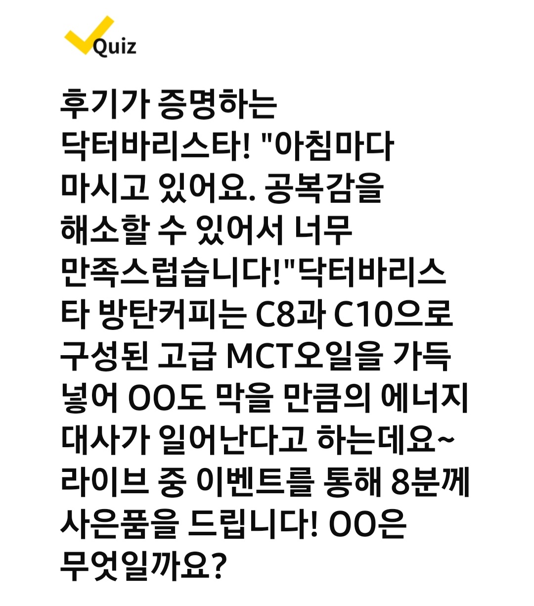 Q. 후기가 증명하는 닥터바리스타! "아침마다 마시고 있어요. 공복감을 해소할 수 있어서 너무 만족스럽습니다!"닥터바리스타 방탄커피는 C8과 C10으로 구성된 고급 MCT오일을 가득 넣어 OO도 막을 만큼의 에너지 대사가 일어난다고 하는데요~ 라이브 중 이벤트를 통해 8분께 사은품을 드립니다! OO은 무엇일까요?