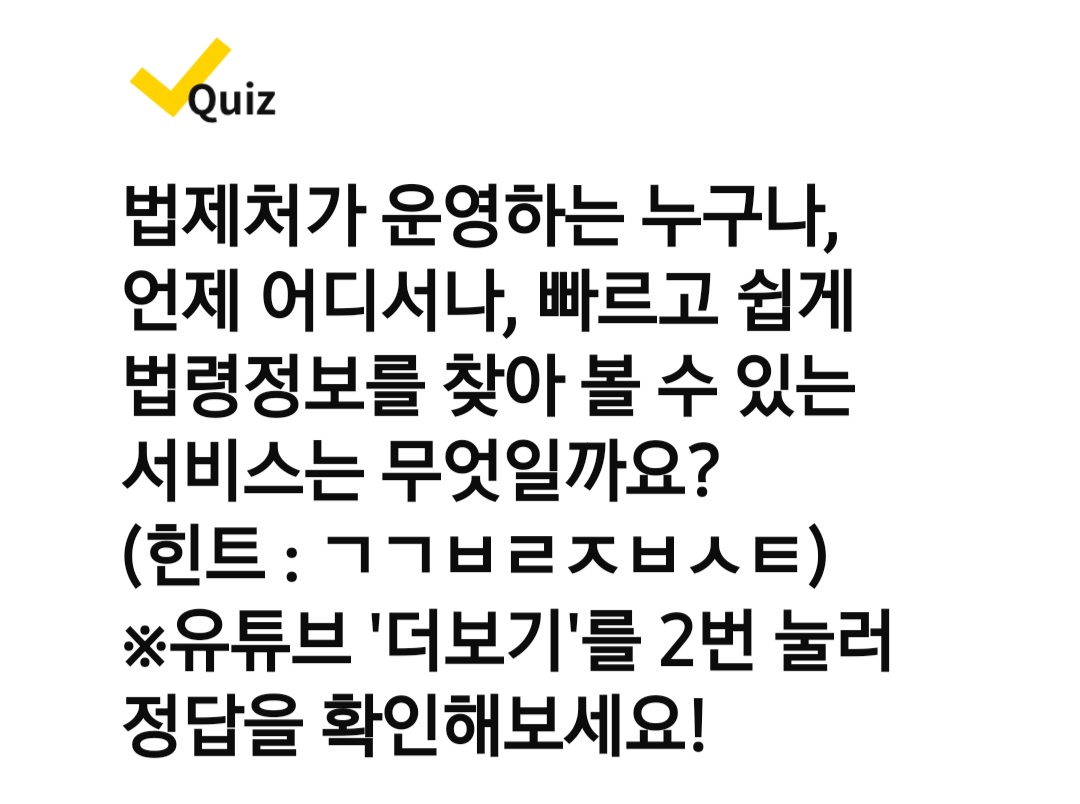Q. 법제처가 운영하는 누구나, 언제 어디서나, 빠르고 쉽게 법령정보를 찾아 볼 수 있는 서비스는 무엇일까요? (힌트:ㄱㄱㅂㄹㅈㅂㅅㅌ)